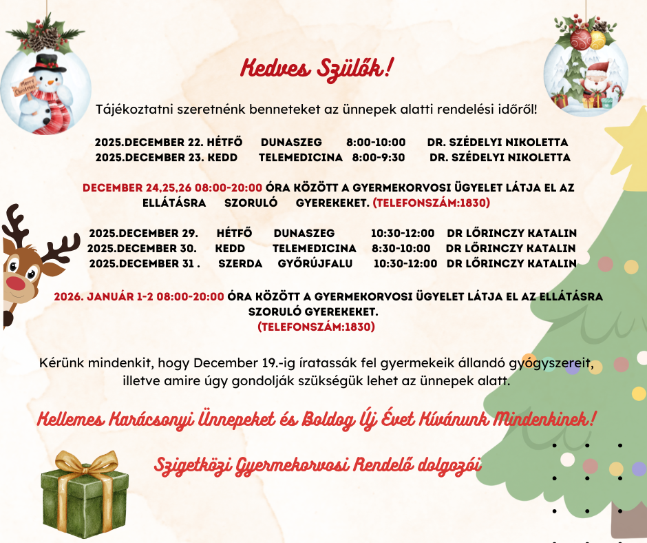 2025.12.13.-án szombaton jelenléti rendelést nem tartunk, telemedicinális ellátás keretében, szükség esetén 8:00-10:00 között Dr. Lőrinczy Katalin hívható (06304469090)! Debóra email, messengeren elérhető lesz.